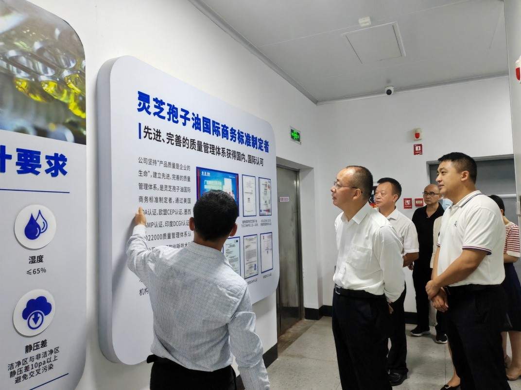 调研组一行到灵芝孢子油生产线进行实地参观,并对其生产工艺和流程进行详细地了解。