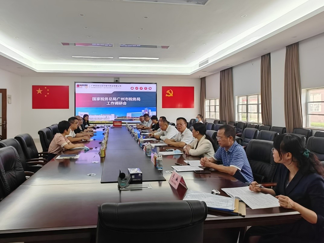 6月19日,国家税务总局广东省税务局党委副书记、广州市税务局党委书记、局长、一级巡视员杨绪春,广州市税务局副局级干部谢政以及从化区税务局、温泉镇税务所相关领导一行到白云山汉方开展实地调研工作。公司总经理韩亚明、副总经理易建峰、党总支副书记郑燕华、财务副总监王晓枫和财务经理施佩琦参加了调研会议。