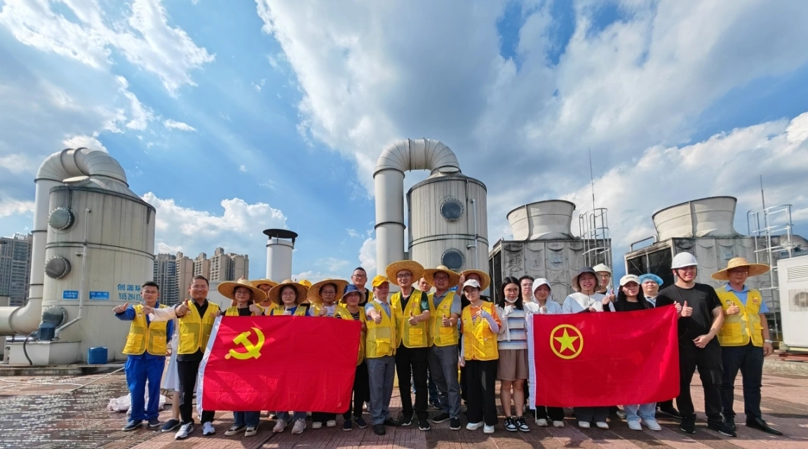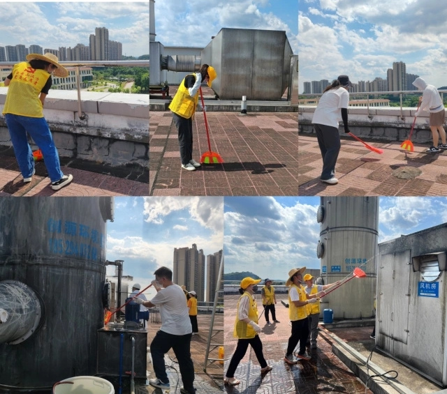 在副总经理易建峰的带领下,党团员对综合车间楼顶进行“地毯式”清理。烈日炎炎,志愿者们始终保持昂扬振奋的精神状态,充分发扬不怕脏不怕苦不怕累的奋斗精神,分工合作,默契配合,对废气处理系统的喷淋塔和风管等地方进行清扫。