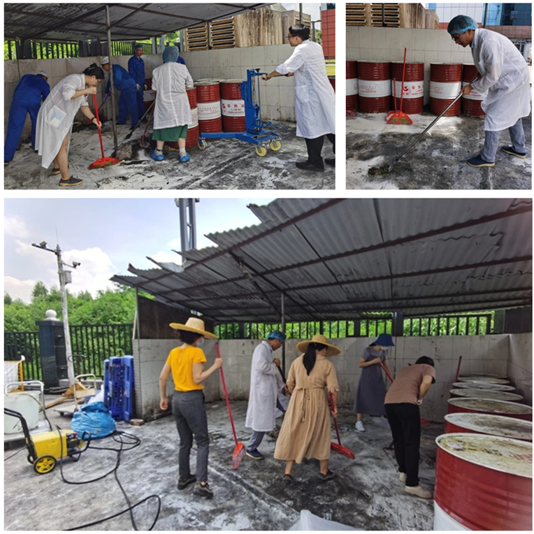 活动现场,在第六党支部书记巫建新的带领下,党员们分工明确,有的对原有废弃物进行搬运和分类,有的用扫帚清扫暂存池,有的用高压喷枪对现场进行清洗。大家热情高涨、干劲十足,在最短的时间内高效完成清扫任务。