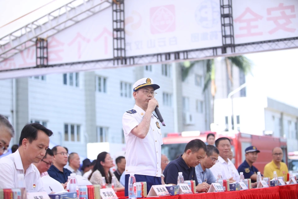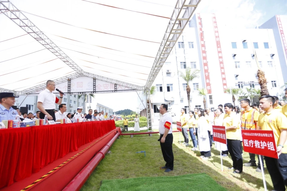 广州市应急管理局党委委员、副局长李润培,危化处处长陈华康,广州市消防救援支队重点保卫处处长赵智键,广州市公安内保支队四级高级警长王占军以及属地政府相关领导出席并指导演练。