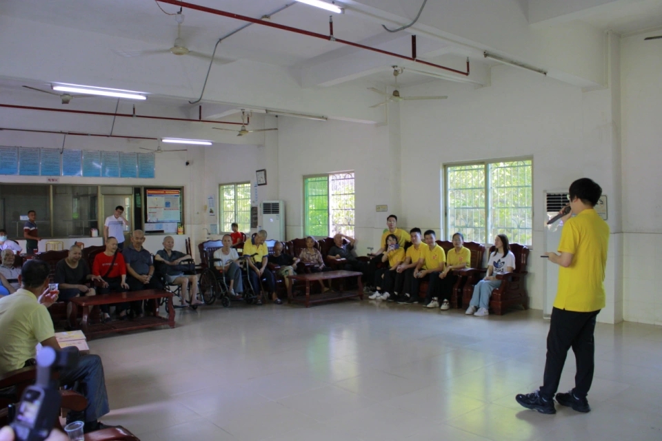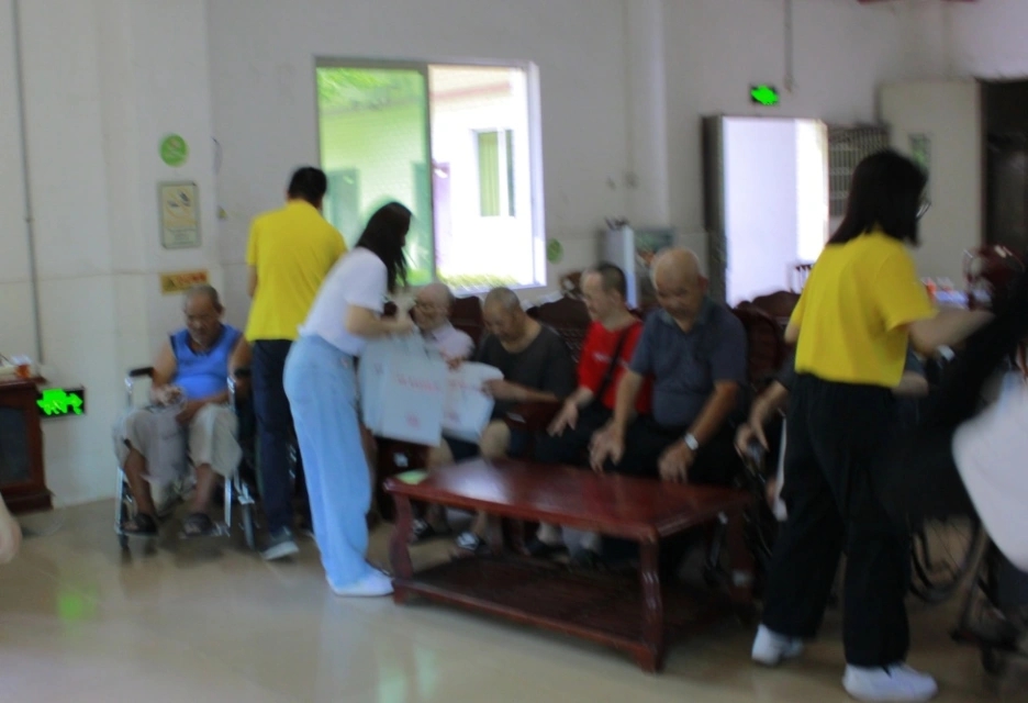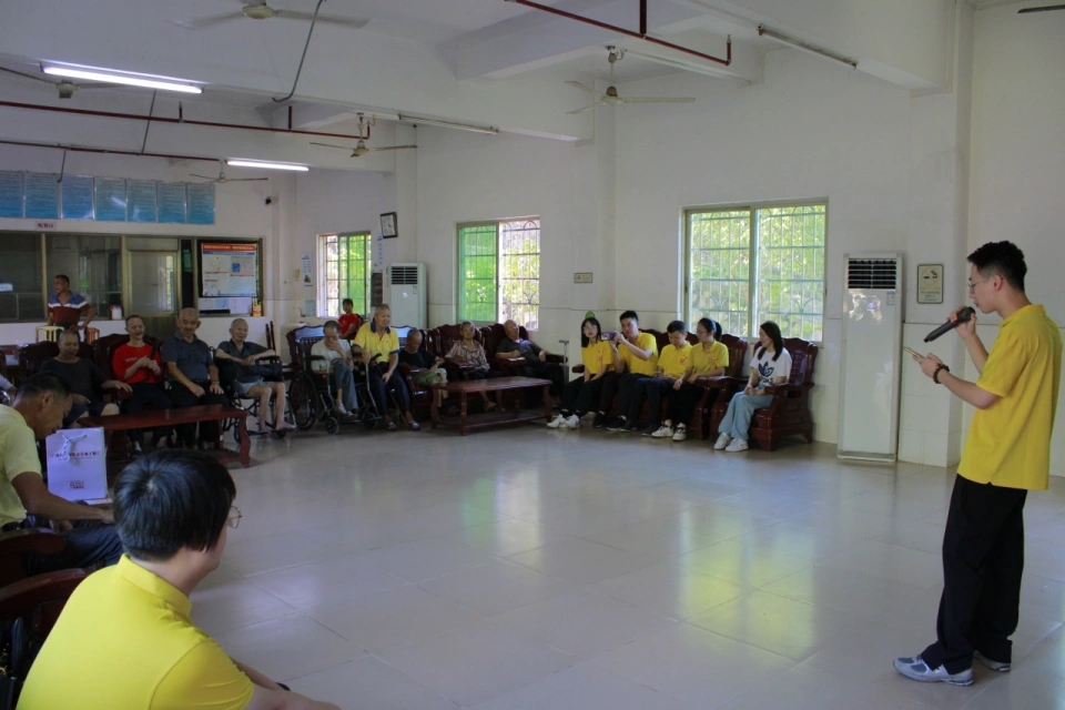 白云山汉方党团负责人组织青年代表到从化区良口镇敬老院看望老人,陪他们聊天、为他们表演节目。