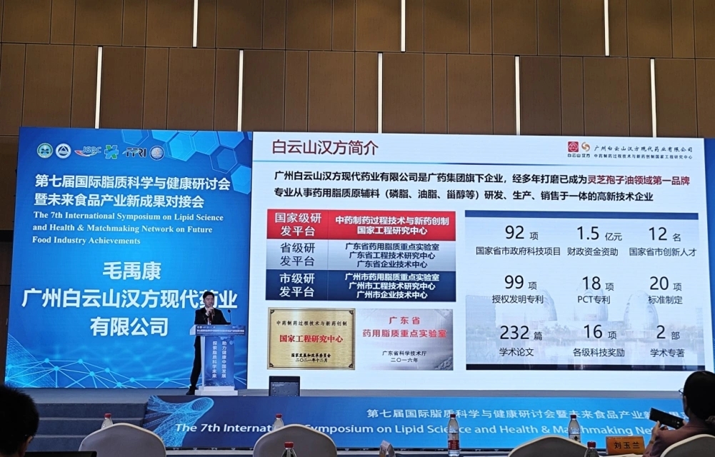 在本次会议上,中药制造过程技术与新药创制国家工程研究中心技术骨干、白云山汉方公司课题组长毛禹康博士进行了题为“传统中药灵芝的功能性油脂活性研究进展及其产业发展”的主题报告,全面、综合地阐述了灵芝孢子油作为传统中药灵芝主要功能性油脂的活性研究进展与产业现状,并着重介绍了白云山汉方针对减轻化疗不良反应、调节免疫、缓解体力疲劳等不同方面深入开展的多项灵芝孢子油活性研究。