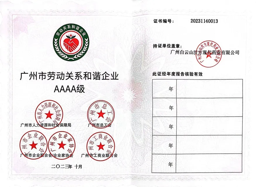 近日,根据《广州市创建劳动和谐企业单位评审管理办法》要求,经广州市各区劳动关系三方协商会议初审、广州市劳动关系协商会议复审,白云山汉方获评“广州市劳动关系和谐企业AAAA级”称号。