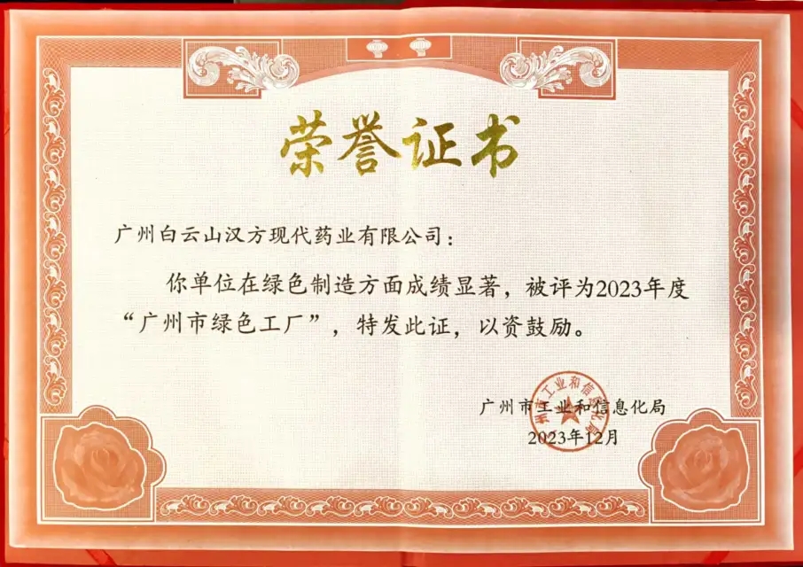 12月13日,广州市工业和信息化局对获得2023年“广州市绿色工厂”的企业举行了授牌仪式。白云山汉方被授予“广州市绿色工厂”荣誉牌匾及证书,标志着白云山汉方公司绿色制造发展再上新台阶。