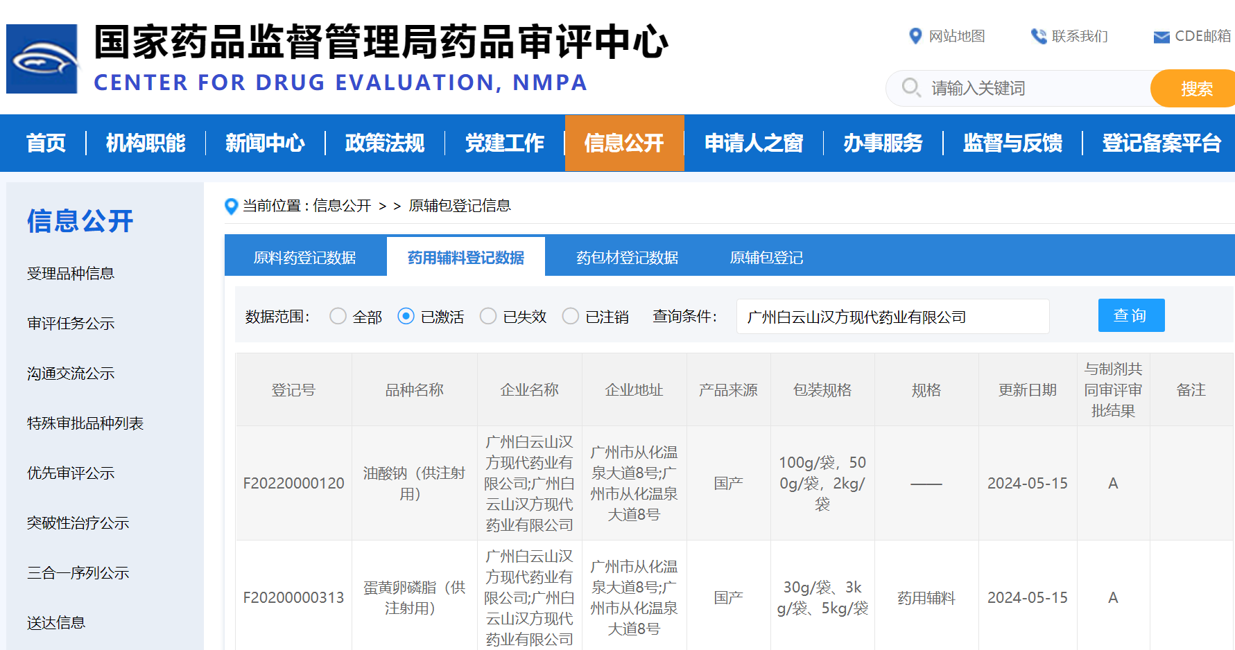 旗下白云山汉方自主研发的两款药用辅料——蛋黄卵磷脂(供注射用)和油酸钠(供注射用)顺利通过审评,在CDE原辅包登记信息公示为“A”状态!