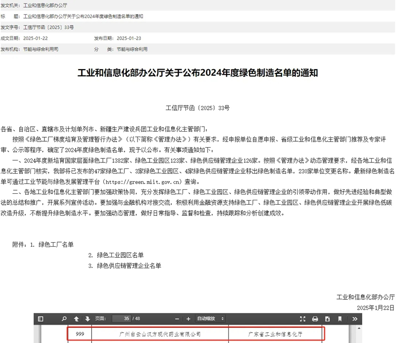 (以下简称:白云山汉方)凭借其在绿色工厂绩效方面的卓越表现,在取得“广东省绿色工厂”称号的基础上成功入选国家级“绿色工厂”名单,提高了汉方制造的“含智量、含绿量”。